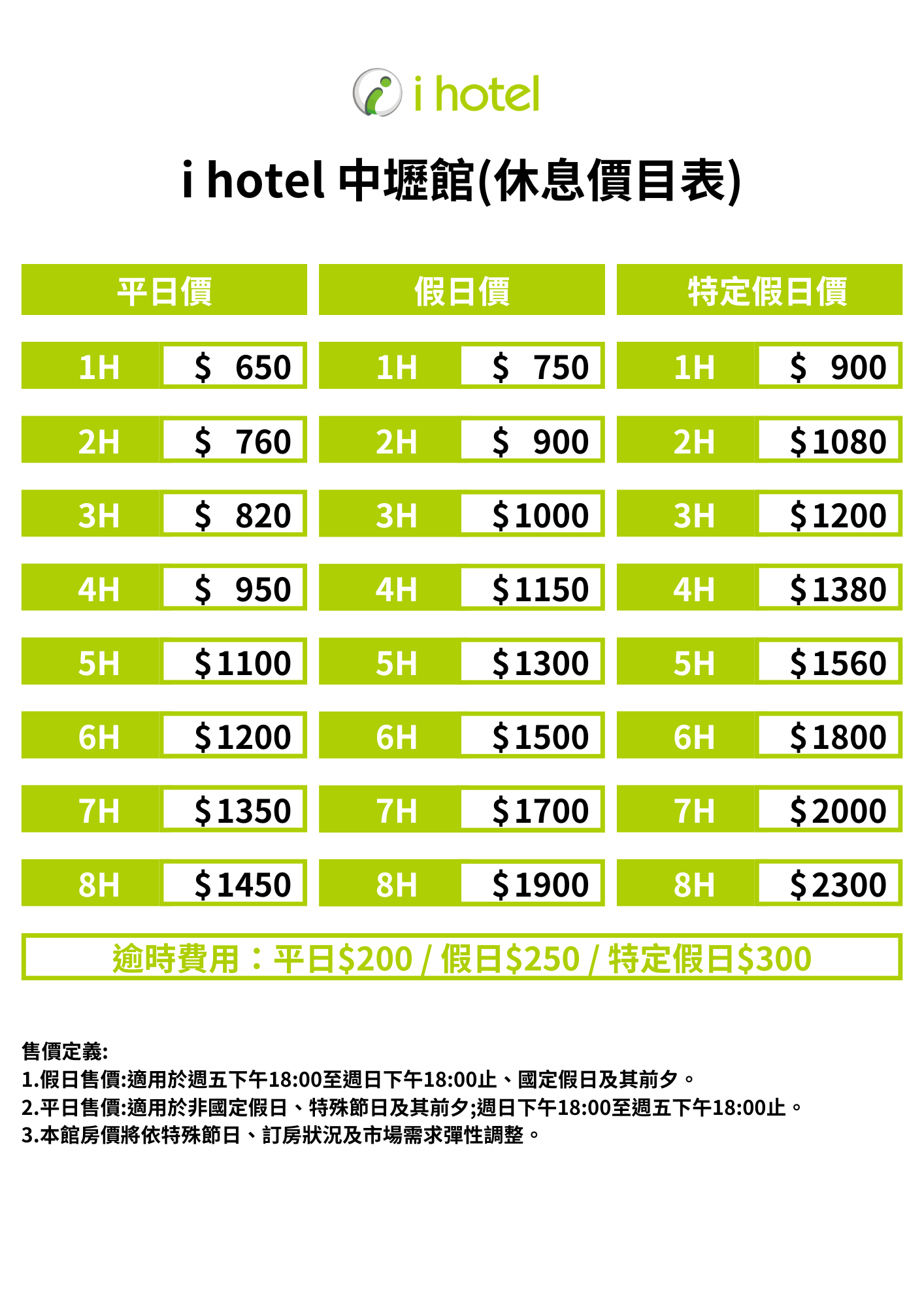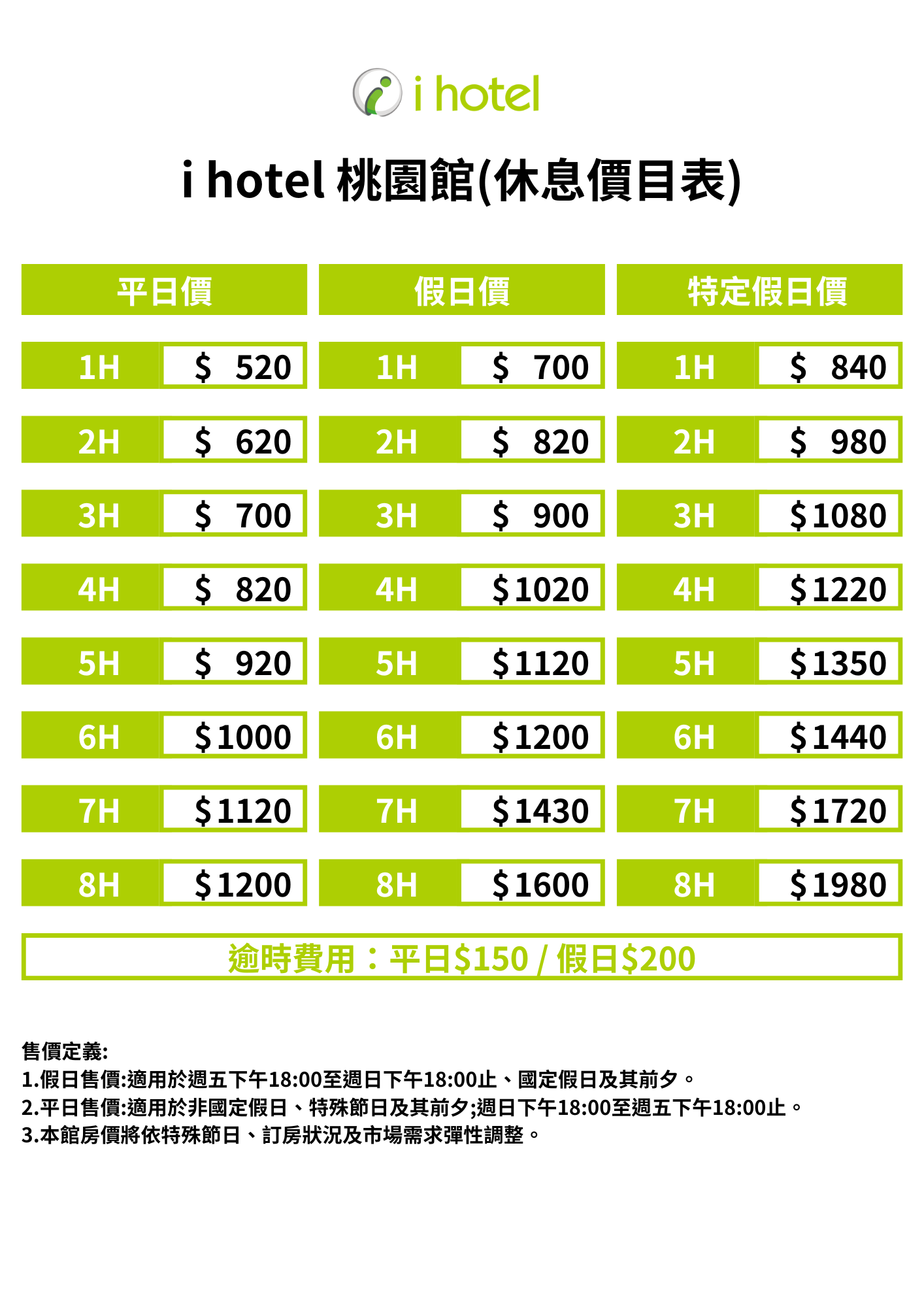 休息價目表